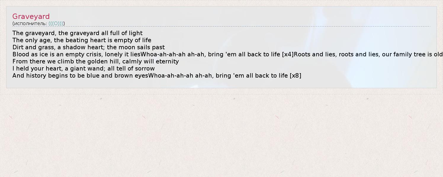 Blood as ice is an empty crisis, lonely it liesWhoa-ah-ah-ah ah-ah, bring 'em all back to life [x4]Roots and lies, roots and lies, our family tree is old