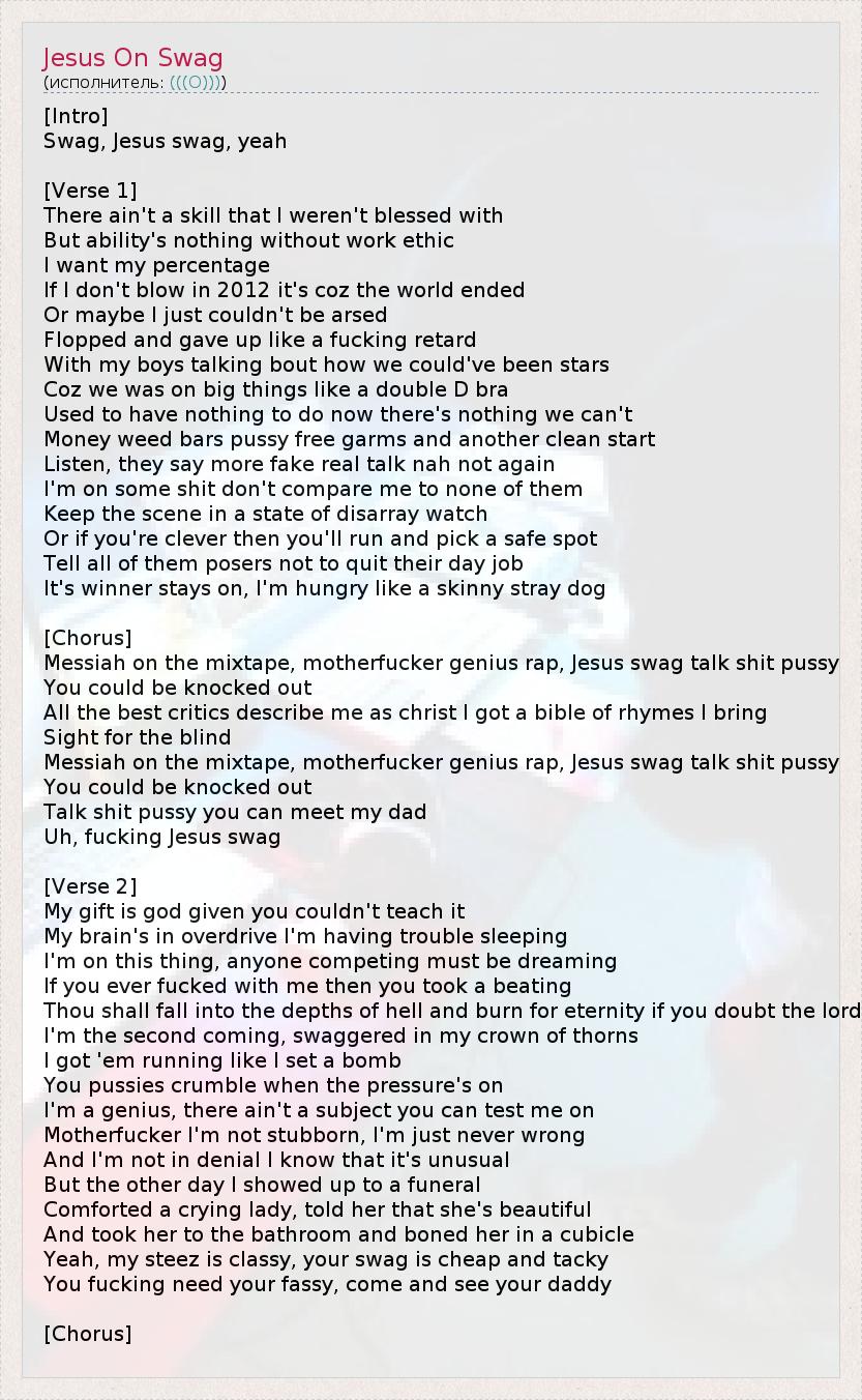 А как ты думаешь, о чем песня "Jesus On Swag" ?