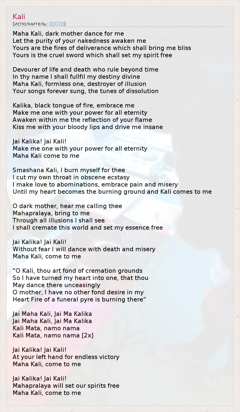 Маха Кали, темная мать, танцуй для меня! Путь чистота твоей наготы воспламенит мое сердце! Ты – пламя освобождения, что принесет мне блаженство! Ты – жестокий меч, что освободит мою душу! Уничтожающая жизнь и смерть, та, кто правит вне времени, Во имя тебя я исполню мою блаженную судьбу! Маха Кали, аморфный дух, разрушительница иллюзий. Твои песни звучат вечно, мелодии растворения! Калика, черный язык пламени, обними меня! Сделай меня единым с твоей силой до скончания времен. Разожги внутри меня отблеск твоего пламени, Поцелуй меня кровавыми губами и веди меня, безумного! Хей, Калика! Хей, Кали! Сделай меня единым с твоей силой до скончания времен. Маха Кали, иди ко мне! Шмашана Кали, я сгорю ради тебя! Я перережу свое горло в грязном экстазе! Я буду заниматься любовью с гнусью, терпеть боль и несчастье До тех пор, пока мое сердце не станет местом сожжения и Кали не явится мне! О, темная мать, услышь, как я зову тебя! Махапралайя, явись же Назло всем тем иллюзиям, что вижу я! Я сожгу этот мир и освобожу мой дух! Хей, Калика! Хей, Кали! Без страха я буду танцевать со смертью и бедой! Маха Кали, иди ко мне! "О, Кали, ты любишь места для кремаций. Я оставил свое сердце в одном из них, чтобы ты Начала танцевать здесь не останавливаясь. О, мать, мое сердце больше ничего не желает. Огонь погребального костра горит здесь!" Jai Maha Kali, Jai Ma Kalika Jai Maha Kali, Jai Ma Kalika Kali Mata, namo nama Kali Mata, namo nama [2x] Хей, Калика! Хей, Кали! В твоей левой руке ключ к решительной победе! Маха Кали, иди ко мне! Хей, Калика! Хей, Кали! Махапралая освободит наши души! Маха Кали, иди ко мне!