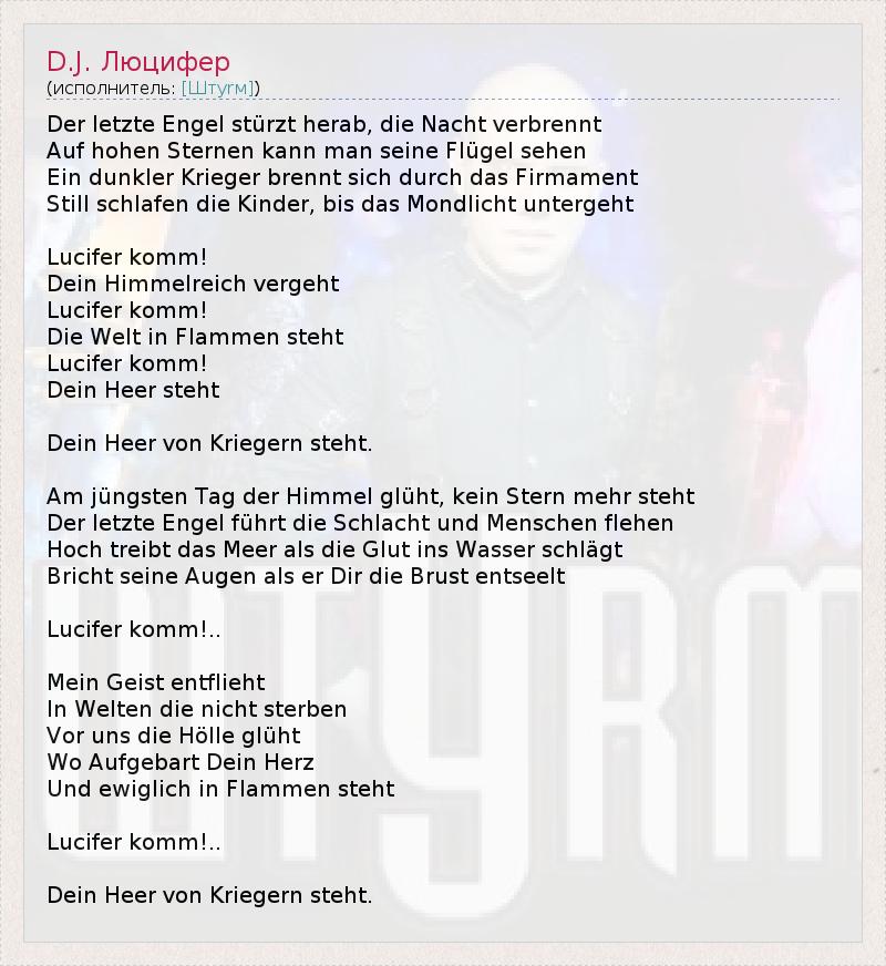 Der letzte Engel stürzt herab, die Nacht verbrennt Auf hohen Sternen kann man seine Flügel sehen Ein dunkler Krieger brennt sich durch das Firmament Still schlafen die Kinder, bis das Mondlicht untergeht Lucifer komm! Dein Himmelreich vergeht Lucifer komm! Die Welt in Flammen steht Lucifer komm! Dein Heer steht Dein Heer von Kriegern steht. Am jüngsten Tag der Himmel glüht, kein Stern mehr steht Der letzte Engel führt die Schlacht und Menschen flehen Hoch treibt das Meer als die Glut ins Wasser schlägt Bricht seine Augen als er Dir die Brust entseelt Lucifer komm!.. Mein Geist entflieht In Welten die nicht sterben Vor uns die Hölle glüht Wo Aufgebart Dein Herz Und ewiglich in Flammen steht Lucifer komm!.. Dein Heer von Kriegern steht.