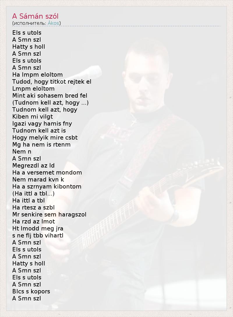 Это интересно:Акос Ковач (Ákos) родился 6 апреля 1968 года в Будапеште. Раньше Акос играл в группе Bonanza Banzai, а после ее распада в1995 году занялся сольной карьерой. В 1999 году Акос перевел песни Фила Коллинза к мультфильму "Тарзан" на венгерский язык.Также он известен серьезными поэтическими текстами, которые пишет сам. Его можно назвать одним из самых известных поп-рок-исполнителей из Венгрии.Имя... продолжение