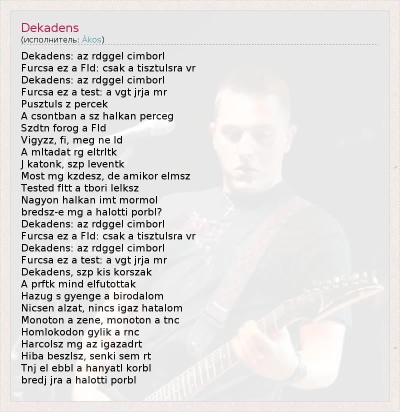 Это интересно:Акос Ковач (Ákos) родился 6 апреля 1968 года в Будапеште. Раньше Акос играл в группе Bonanza Banzai, а после ее распада в1995 году занялся сольной карьерой. В 1999 году Акос перевел песни Фила Коллинза к мультфильму "Тарзан" на венгерский язык.Также он известен серьезными поэтическими текстами, которые пишет сам. Его можно назвать одним из самых известных поп-рок-исполнителей из Венгрии.Имя... продолжение