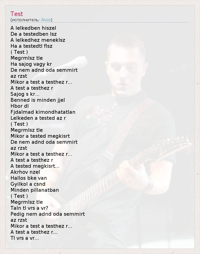Это интересно:Акос Ковач (Ákos) родился 6 апреля 1968 года в Будапеште. Раньше Акос играл в группе Bonanza Banzai, а после ее распада в1995 году занялся сольной карьерой. В 1999 году Акос перевел песни Фила Коллинза к мультфильму "Тарзан" на венгерский язык.Также он известен серьезными поэтическими текстами, которые пишет сам. Его можно назвать одним из самых известных поп-рок-исполнителей из Венгрии.Имя... продолжение
