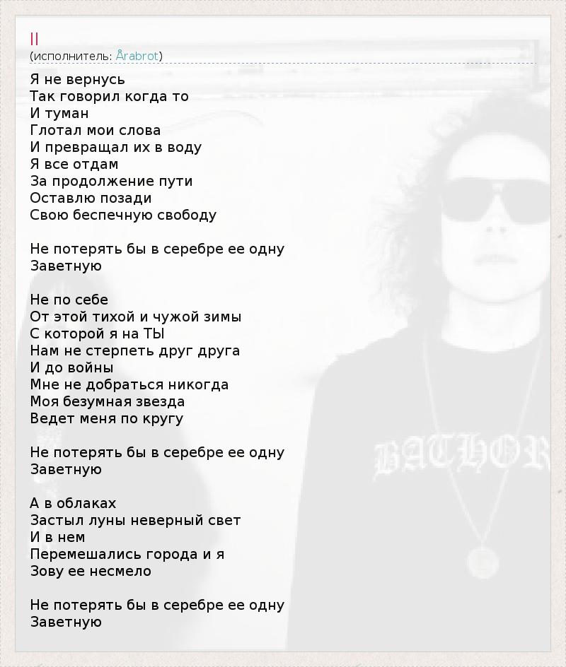 Я не вернусь Так говорил когда то И туман Глотал мои слова И превращал их в воду Я все отдам За продолжение пути Оставлю позади Свою беспечную свободу Не потерять бы в серебре ее одну Заветную Не по себе От этой тихой и чужой зимы С которой я на ТЫ Нам не стерпеть друг друга И до войны Мне не добраться никогда Моя безумная звезда Ведет меня по кругу Не потерять бы в серебре ее одну Заветную А в облаках Застыл луны неверный свет И в нем Перемешались города и я Зову ее несмело Не потерять бы в серебре ее одну Заветную