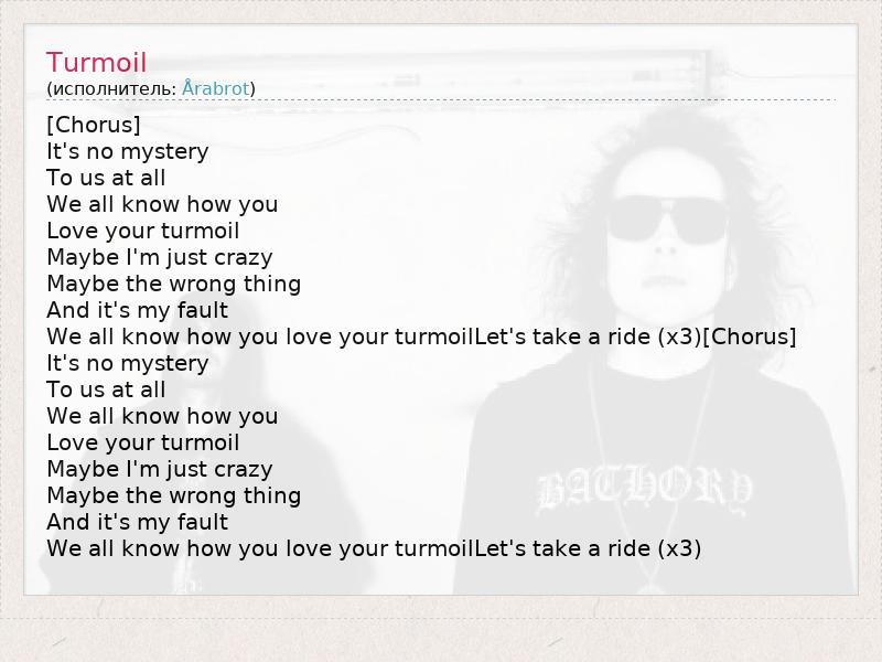 [Chorus] It's no mystery To us at all We all know how you Love your turmoil Maybe I'm just crazy Maybe the wrong thing And it's my fault We all know how you love your turmoilLet's take a ride (x3)[Chorus] It's no mystery To us at all We all know how you Love your turmoil Maybe I'm just crazy Maybe the wrong thing And it's my fault We all know how you love your turmoilLet's take a ride (x3)