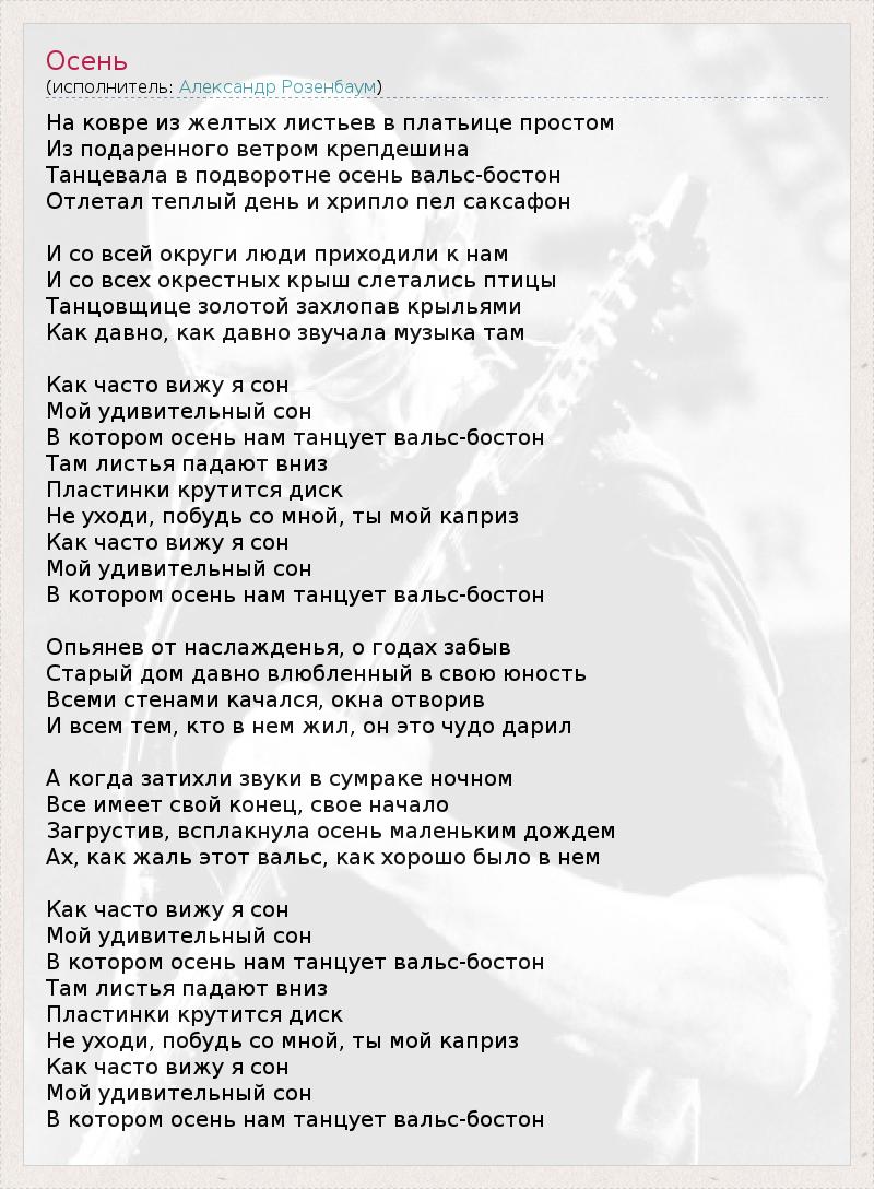 Это интересно:Александр Яковлевич Розенбаум (род. 13 сентября 1951, Ленинград) — исполнитель авторской песни.В 1968—1974 учился в Первом медицинском институте в Ленинграде. Работал врачом скорой помощи. Занимался в вечернем джазовом училище при Дворце культуры имени Кирова. Началом сольной деятельности можно считать памятное выступление 14 октября 1983 года в Доме культуры МВД имени Дзержинского.Розенбаум... продолжение