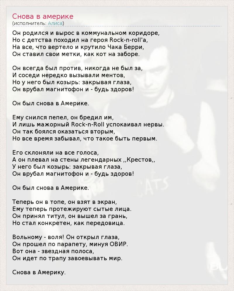 Он родился и вырос в коммунальном коридоре, Но с детства походил на героя Rock-n-roll'а, На все, что вертело и крутило Чака Берри, Он ставил свои метки, как кот на заборе. Он всегда был против, никогда не был за, И соседи нередко вызывали ментов, Но у него был козырь: закрывая глаза, Он врубал магнитофон и - будь здоров! Он был снова в Америке. Ему снился пепел, он бредил им, И лишь мажорный Rock-n-Roll успокаивал нервы. Он так боялся оказаться вторым, Но все время забывал, что такое быть первым. Его склоняли на все голоса, А он плевал на стены легендарных ,,Крестов,, У него был козырь: закрывая глаза, Он врубал магнитофон и - будь здоров! Он был снова в Америке. Теперь он в топе, он взят в экран, Ему теперь протежируют сытые лица. Он принял титул, он вышел за грань, Но стал конкретен, как передовица. Вольному - воля! Он открыл глаза, Он прошел по парапету, минуя ОВИР. Вот она - звездная полоса, Он идет по трапу завоевывать мир. Снова в Америку.