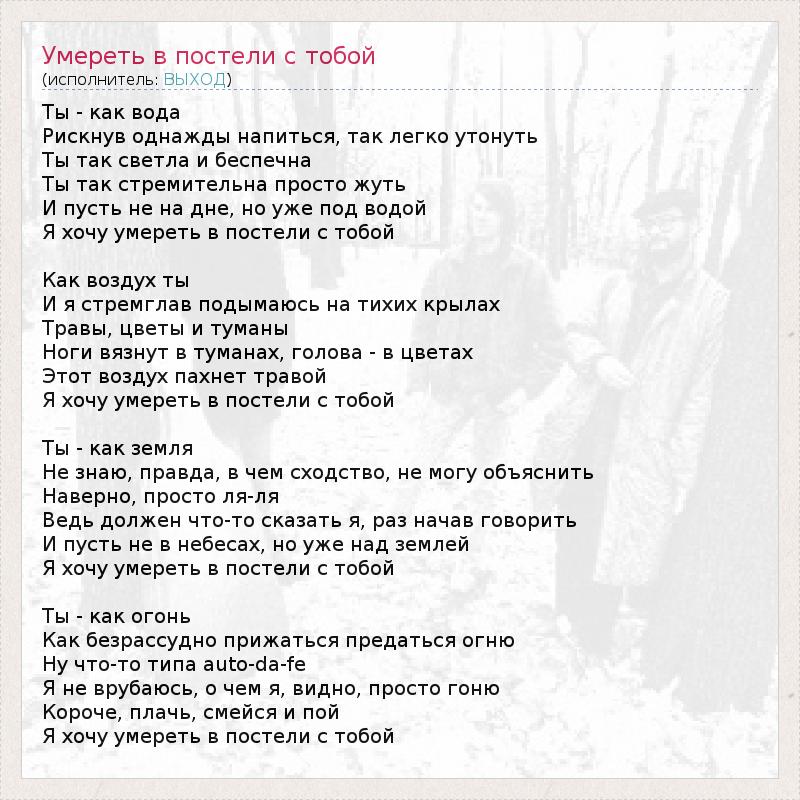 А как ты думаешь, о чем песня "Умереть в постели с тобой" ?