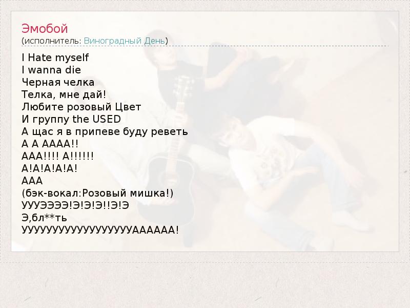 Это интересно:Группа Виноградный День образовалась когда-то весной 2006, вследствие обдуманной пьянки двух настоящих пАдонков (Их имена называть не буду, т.к. спецслужбы уже предпринимают попытки подрыва нашей деятельности). Так за несколько часов был избран стиль - Math&Grind - самый бесчеловечный и апокалиптический музыкальный жанр. После чего группа приступает к записи дебютного альбома на АхуетьНефстать... продолжение