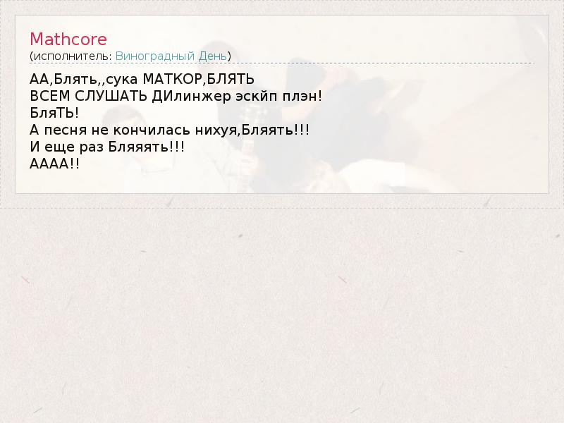 Это интересно:Группа Виноградный День образовалась когда-то весной 2006, вследствие обдуманной пьянки двух настоящих пАдонков (Их имена называть не буду, т.к. спецслужбы уже предпринимают попытки подрыва нашей деятельности). Так за несколько часов был избран стиль - Math&Grind - самый бесчеловечный и апокалиптический музыкальный жанр. После чего группа приступает к записи дебютного альбома на АхуетьНефстать... продолжение