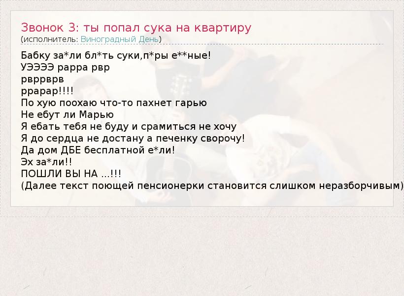 А как ты думаешь, о чем песня "Звонок 3: ты попал сука на квартиру" ?