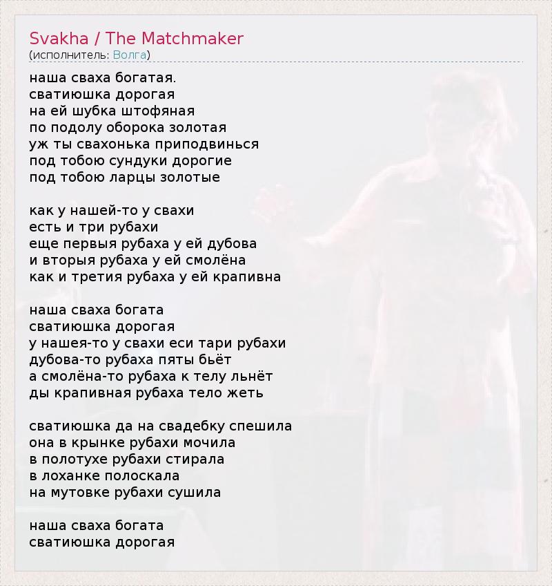 А как ты думаешь, о чем песня "Svakha / The Matchmaker" ?