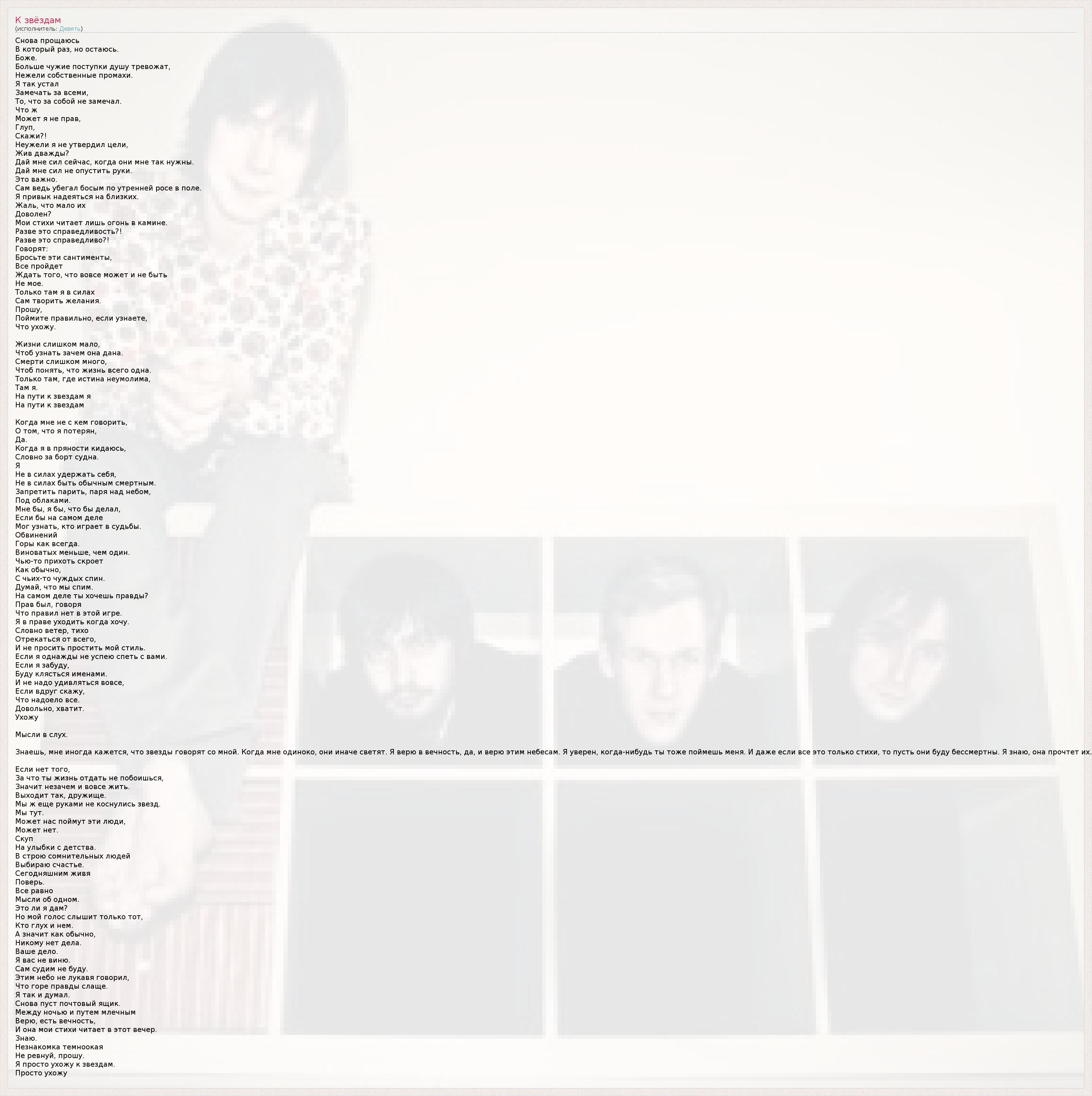 Знаешь, мне иногда кажется, что звезды говорят со мной. Когда мне одиноко, они иначе светят. Я верю в вечность, да, и верю этим небесам. Я уверен, когда-нибудь ты тоже поймешь меня. И даже если все это только стихи, то пусть они буду бессмертны. Я знаю, она прочтет их.