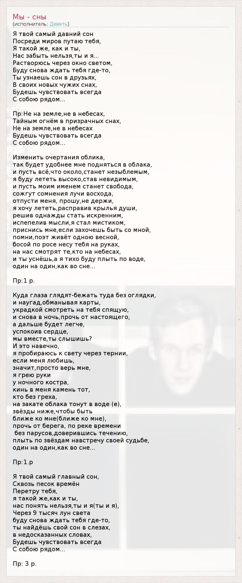 Я твой самый давний сон Посреди миров путаю тебя, Я такой же, как и ты, Нас забыть нельзя,ты и я... Растворюсь через окно светом, Буду снова ждать тебя где-то, Ты узнаешь сон в друзьях, В своих новых чужих снах, Будешь чувствовать всегда С собою рядом... Пр:Не на земле,не в небесах, Тайным огнём в призрачных снах, Не на земле,не в небесах Будешь чувствовать всегда С собою рядом... Изменить очертания облика, так будет удобнее мне подняться в облака, и пусть всё,что около,станет незыблемым, я буду лететь высоко,став невидимым, и пусть моим именем станет свобода, сожгут сомнения лучи восхода, отпусти меня, прошу,не держи, я хочу лететь,расправив крылья души, решив однажды стать искренним, испепелив мысли,я стал мистиком, приснись мне,если захочешь быть со мной, помни,поэт живёт одною весной, босой по росе несу тебя на руках, на нас смотрят те,кто на небесах, и ты уснёшь,а я тихо буду плыть по воде, один на один,как во сне... Пр:1 р. Куда глаза глядят-бежать туда без оглядки, и наугад,обманывая карты, украдкой смотреть на тебя спящую, и снова в ночь,прочь от настоящего, а дальше будет легче, успокоив сердце, мы вместе,ты слышишь? И это навечно, я пробираюсь к свету через тернии, если меня любишь, значит,просто верь мне, я грею руки у ночного костра, кинь в меня камень тот, кто без греха, на закате облака тонут в воде (е), звёзды ниже,чтобы быть ближе ко мне(ближе ко мне), прочь от берега, по реке времени без парусов,доверившись течению, плыть по звёздам навстречу своей судьбе, один на один,как во сне... Пр:1.р Я твой самый главный сон, Сквозь песок времён Перетру тебя, я такой же,как и ты, нас понять нельзя,ты и я(ты и я), Через 9 тысяч лун света буду снова ждать тебя где-то, ты найдёшь свой сон в слезах, в недосказанных словах, Будешь чувствовать всегда С собою рядом... Пр: 3 р.