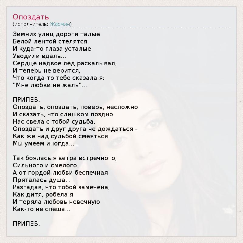 Зимних улиц дороги талые Белой лентой стелятся. И куда-то глаза усталые Уводили вдаль... Сердце надвое лёд раскалывал, И теперь не верится, Что когда-то тебе сказала я: "Мне любви не жаль"... ПРИПЕВ: Опоздать, опоздать, поверь, несложно И сказать, что слишком поздно Нас свела с тобой судьба. Опоздать и друг друга не дождаться - Как же над судьбой смеяться Мы умеем иногда... Так боялась я ветра встречного, Сильного и смелого. А от гордой любви беспечная Пряталась душа... Разгадав, что тобой замечена, Как дитя, робела я И теряла любовь невечную Как-то не спеша... ПРИПЕВ: