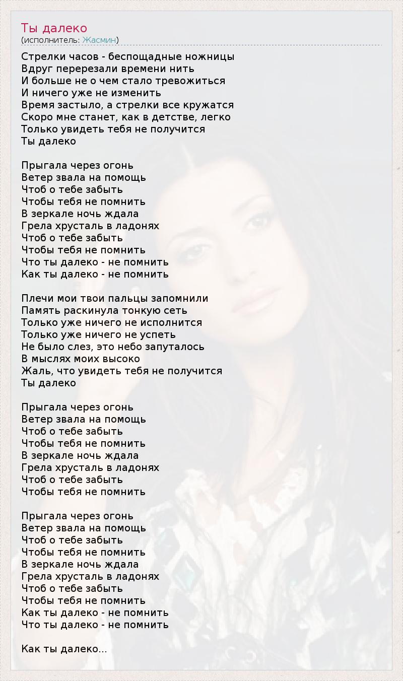 Стрелки часов - беспощадные ножницы Вдруг перерезали времени нить И больше не о чем стало тревожиться И ничего уже не изменить Время застыло, а стрелки все кружатся Скоро мне станет, как в детстве, легко Только увидеть тебя не получится Ты далеко Прыгала через огонь Ветер звала на помощь Чтоб о тебе забыть Чтобы тебя не помнить В зеркале ночь ждала Грела хрусталь в ладонях Чтоб о тебе забыть Чтобы тебя не помнить Что ты далеко - не помнить Как ты далеко - не помнить Плечи мои твои пальцы запомнили Память раскинула тонкую сеть Только уже ничего не исполнится Только уже ничего не успеть Не было слез, это небо запуталось В мыслях моих высоко Жаль, что увидеть тебя не получится Ты далеко Прыгала через огонь Ветер звала на помощь Чтоб о тебе забыть Чтобы тебя не помнить В зеркале ночь ждала Грела хрусталь в ладонях Чтоб о тебе забыть Чтобы тебя не помнить Прыгала через огонь Ветер звала на помощь Чтоб о тебе забыть Чтобы тебя не помнить В зеркале ночь ждала Грела хрусталь в ладонях Чтоб о тебе забыть Чтобы тебя не помнить Как ты далеко - не помнить Что ты далеко - не помнить Как ты далеко...