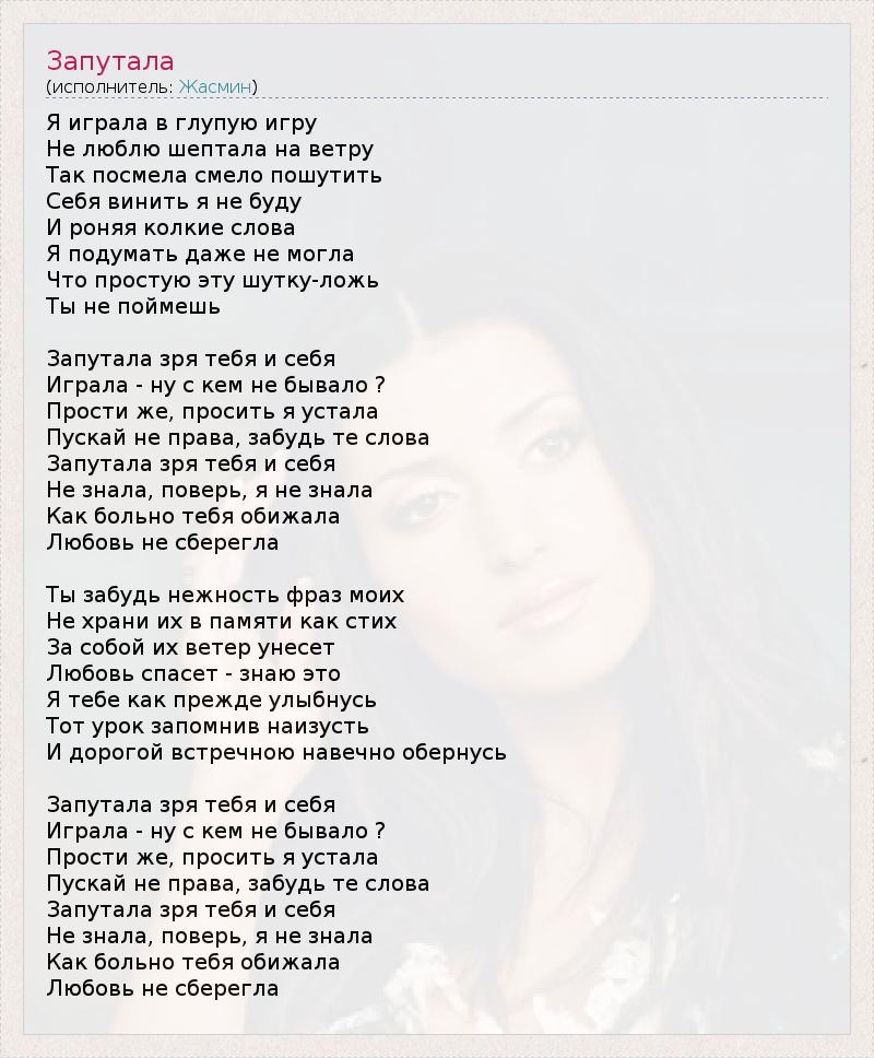 Я играла в глупую игру Не люблю шептала на ветру Так посмела смело пошутить Себя винить я не буду И роняя колкие слова Я подумать даже не могла Что простую эту шутку-ложь Ты не поймешь Запутала зря тебя и себя Играла - ну с кем не бывало ? Прости же, просить я устала Пускай не права, забудь те слова Запутала зря тебя и себя Не знала, поверь, я не знала Как больно тебя обижала Любовь не сберегла Ты забудь нежность фраз моих Не храни их в памяти как стих За собой их ветер унесет Любовь спасет - знаю это Я тебе как прежде улыбнусь Тот урок запомнив наизусть И дорогой встречною навечно обернусь Запутала зря тебя и себя Играла - ну с кем не бывало ? Прости же, просить я устала Пускай не права, забудь те слова Запутала зря тебя и себя Не знала, поверь, я не знала Как больно тебя обижала Любовь не сберегла