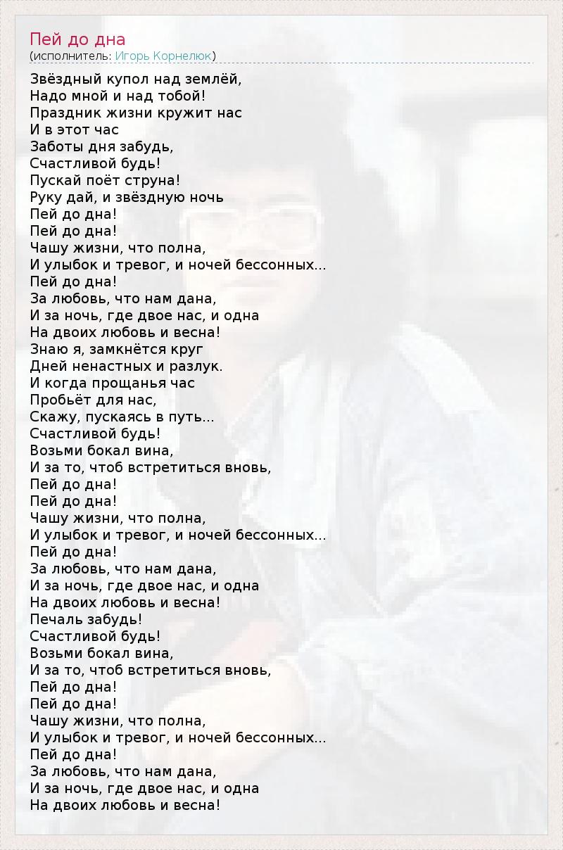 Звёздный купол над землёй, Надо мной и над тобой! Праздник жизни кружит нас И в этот час Заботы дня забудь, Счастливой будь! Пускай поёт струна! Руку дай, и звёздную ночь Пей до дна! Пей до дна! Чашу жизни, что полна, И улыбок и тревог, и ночей бессонных... Пей до дна! За любовь, что нам дана, И за ночь, где двое нас, и одна На двоих любовь и весна! Знаю я, замкнётся круг Дней ненастных и разлук. И когда прощанья час Пробьёт для нас, Скажу, пускаясь в путь... Счастливой будь! Возьми бокал вина, И за то, чтоб встретиться вновь, Пей до дна! Пей до дна! Чашу жизни, что полна, И улыбок и тревог, и ночей бессонных... Пей до дна! За любовь, что нам дана, И за ночь, где двое нас, и одна На двоих любовь и весна! Печаль забудь! Счастливой будь! Возьми бокал вина, И за то, чтоб встретиться вновь, Пей до дна! Пей до дна! Чашу жизни, что полна, И улыбок и тревог, и ночей бессонных... Пей до дна! За любовь, что нам дана, И за ночь, где двое нас, и одна На двоих любовь и весна!