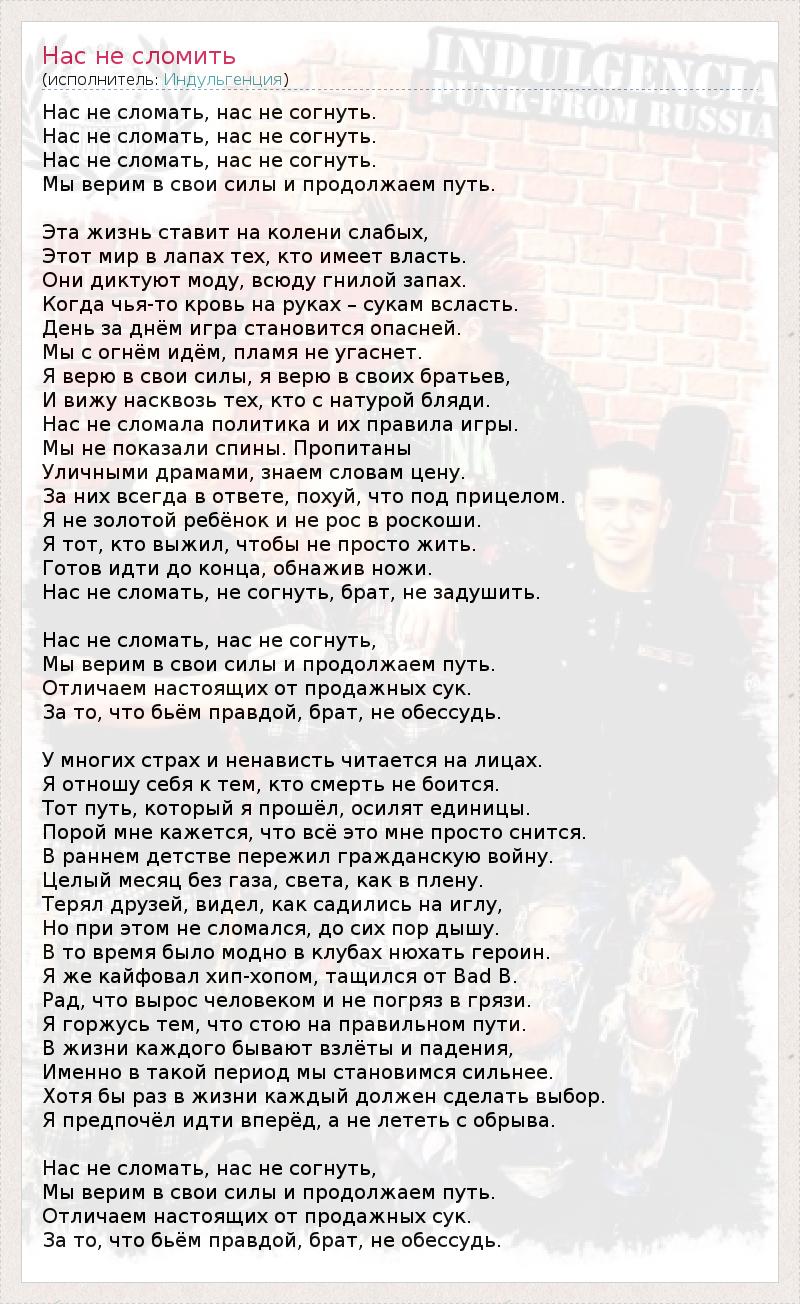 А как ты думаешь, о чем песня "Нас не сломить" ?