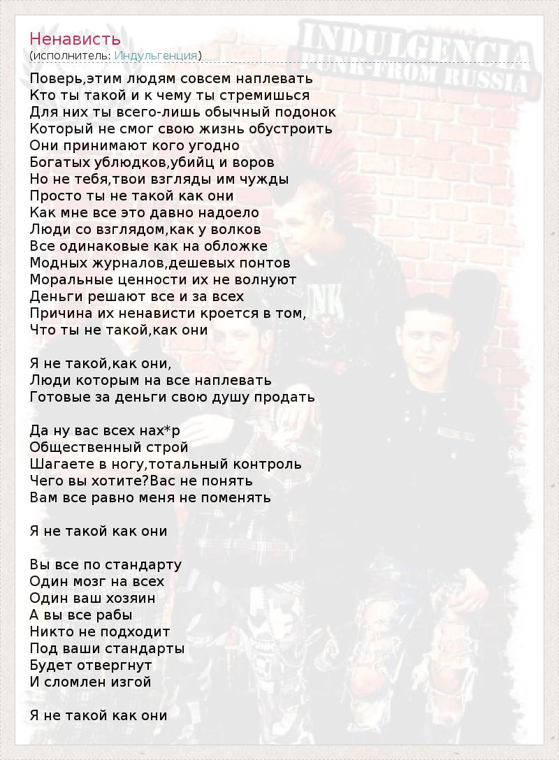 Это интересно:История:Панк коллектив "Индульгенция" создан 6 февраля 2006 года в городе Калининграде, её неизменным лидером барабанщиком Дмитрием Белым. Началом творчества стало желание внести что то своё в современную панк культуру, стремление к сохранению чистоты панк рока.Название "Индульгенция" ( в католической церкви — освобождение от временной кары за грехи) было выбрано... продолжение