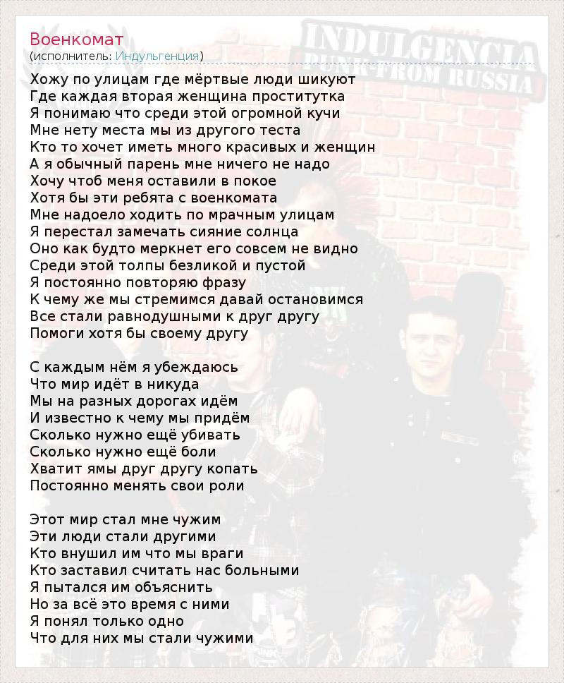 Это интересно:История:Панк коллектив "Индульгенция" создан 6 февраля 2006 года в городе Калининграде, её неизменным лидером барабанщиком Дмитрием Белым. Началом творчества стало желание внести что то своё в современную панк культуру, стремление к сохранению чистоты панк рока.Название "Индульгенция" ( в католической церкви — освобождение от временной кары за грехи) было выбрано... продолжение