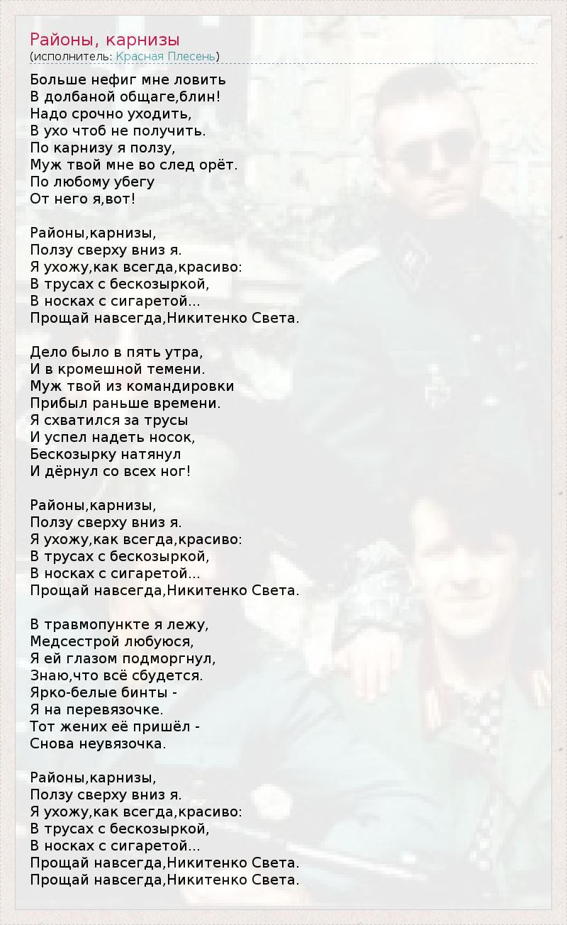 Больше нефиг мне ловить В долбаной общаге,блин! Надо срочно уходить, В ухо чтоб не получить. По карнизу я ползу, Муж твой мне во след орёт. По любому убегу От него я,вот! Районы,карнизы, Ползу сверху вниз я. Я ухожу,как всегда,красиво: В трусах с бескозыркой, В носках с сигаретой... Прощай навсегда,Никитенко Света. Дело было в пять утра, И в кромешной темени. Муж твой из командировки Прибыл раньше времени. Я схватился за трусы И успел надеть носок, Бескозырку натянул И дёрнул со всех ног! Районы,карнизы, Ползу сверху вниз я. Я ухожу,как всегда,красиво: В трусах с бескозыркой, В носках с сигаретой... Прощай навсегда,Никитенко Света. В травмопункте я лежу, Медсестрой любуюся, Я ей глазом подморгнул, Знаю,что всё сбудется. Ярко-белые бинты - Я на перевязочке. Тот жених её пришёл - Снова неувязочка. Районы,карнизы, Ползу сверху вниз я. Я ухожу,как всегда,красиво: В трусах с бескозыркой, В носках с сигаретой... Прощай навсегда,Никитенко Света. Прощай навсегда,Никитенко Света.