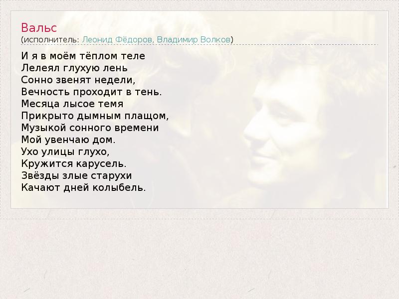 Это интересно:В конце 1990-х, не прекращая работать и выступать в составе "АукцЫона", Леонид Фёдоров стал известен и как сольный исполнитель. Его акустический дебютный CD «Четыресполовинойтонны» увидел свет в 1997 году. Последовавшая затем активная работа совместно с прогрессивным этноджазовым проектом «Волковтрио» нашла своё отражение в записях, изданных на дисках «Зимы не будет» (2000) и «Анабэна»... продолжение