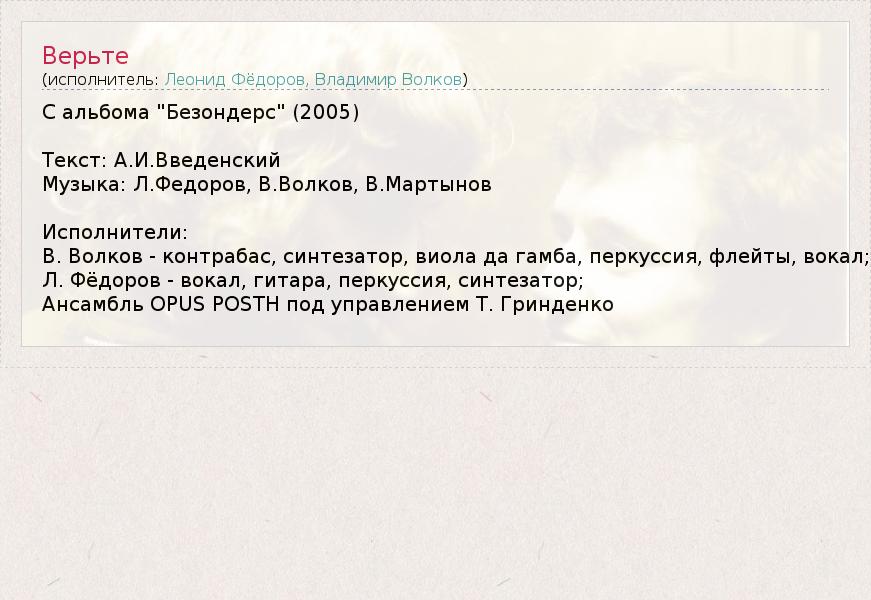 Это интересно:В конце 1990-х, не прекращая работать и выступать в составе "АукцЫона", Леонид Фёдоров стал известен и как сольный исполнитель. Его акустический дебютный CD «Четыресполовинойтонны» увидел свет в 1997 году. Последовавшая затем активная работа совместно с прогрессивным этноджазовым проектом «Волковтрио» нашла своё отражение в записях, изданных на дисках «Зимы не будет» (2000) и «Анабэна»... продолжение