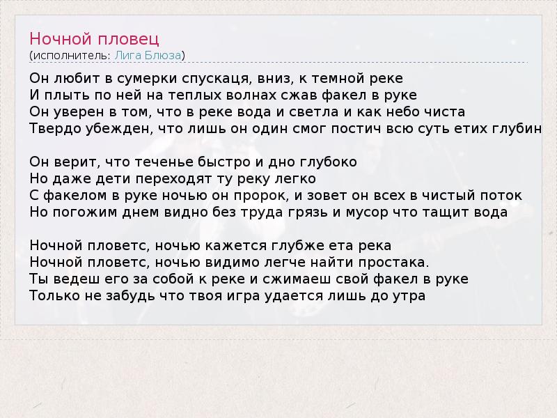 А как ты думаешь, о чем песня "Ночной пловец" ?