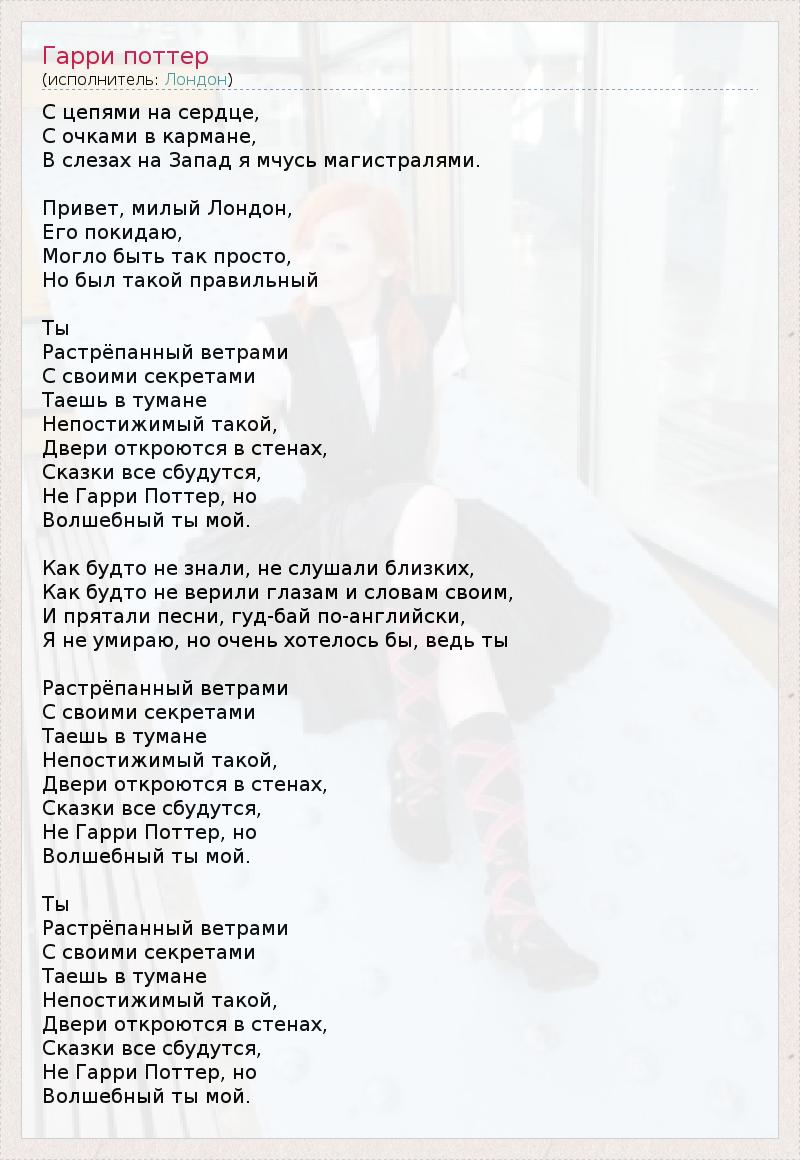 С цепями на сердце, С очками в кармане, В слезах на Запад я мчусь магистралями. Привет, милый Лондон, Его покидаю, Могло быть так просто, Но был такой правильный Ты Растрёпанный ветрами С своими секретами Таешь в тумане Непостижимый такой, Двери откроются в стенах, Сказки все сбудутся, Не Гарри Поттер, но Волшебный ты мой. Как будто не знали, не слушали близких, Как будто не верили глазам и словам своим, И прятали песни, гуд-бай по-английски, Я не умираю, но очень хотелось бы, ведь ты Растрёпанный ветрами С своими секретами Таешь в тумане Непостижимый такой, Двери откроются в стенах, Сказки все сбудутся, Не Гарри Поттер, но Волшебный ты мой. Ты Растрёпанный ветрами С своими секретами Таешь в тумане Непостижимый такой, Двери откроются в стенах, Сказки все сбудутся, Не Гарри Поттер, но Волшебный ты мой.