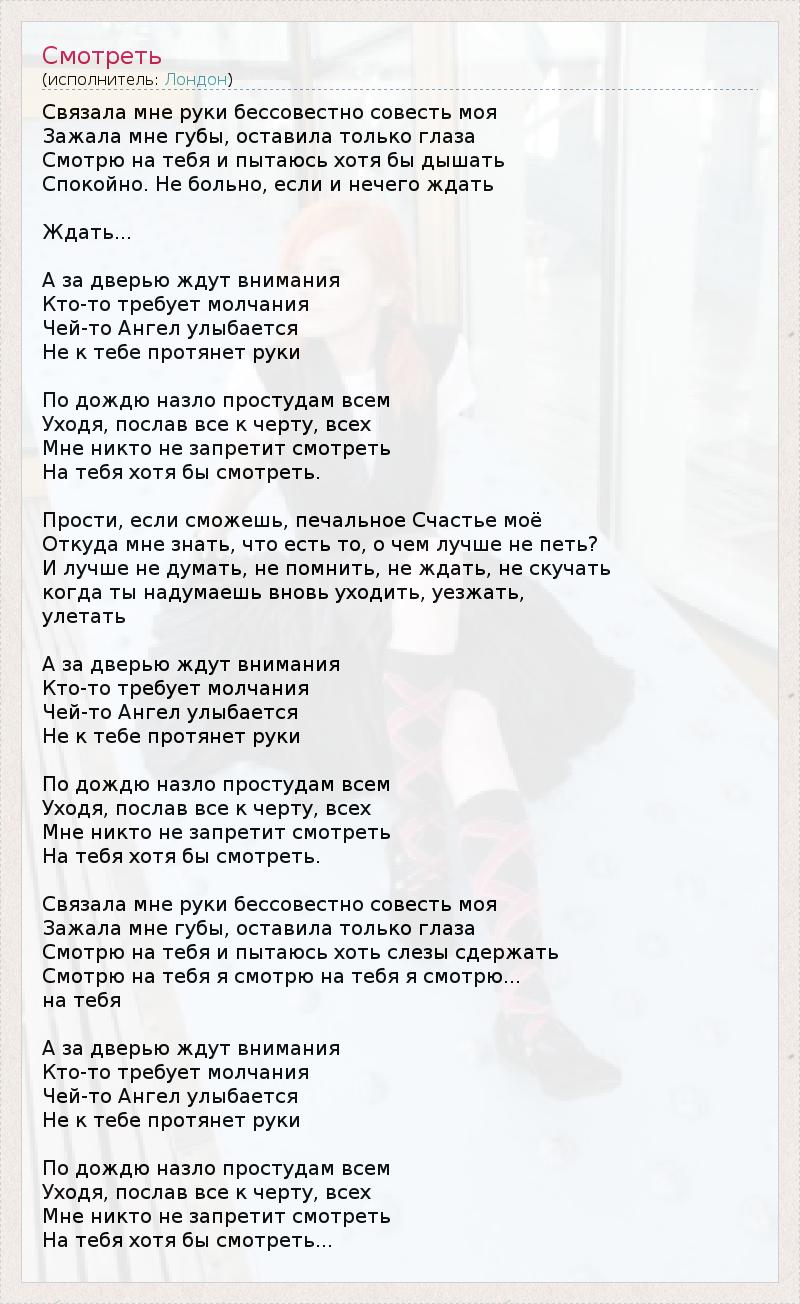 Связала мне руки бессовестно совесть моя Зажала мне губы, оставила только глаза Смотрю на тебя и пытаюсь хотя бы дышать Спокойно. Не больно, если и нечего ждать Ждать... А за дверью ждут внимания Кто-то требует молчания Чей-то Ангел улыбается Не к тебе протянет руки По дождю назло простудам всем Уходя, послав все к черту, всех Мне никто не запретит смотреть На тебя хотя бы смотреть. Прости, если сможешь, печальное Счастье моё Откуда мне знать, что есть то, о чем лучше не петь? И лучше не думать, не помнить, не ждать, не скучать когда ты надумаешь вновь уходить, уезжать, улетать А за дверью ждут внимания Кто-то требует молчания Чей-то Ангел улыбается Не к тебе протянет руки По дождю назло простудам всем Уходя, послав все к черту, всех Мне никто не запретит смотреть На тебя хотя бы смотреть. Связала мне руки бессовестно совесть моя Зажала мне губы, оставила только глаза Смотрю на тебя и пытаюсь хоть слезы сдержать Смотрю на тебя я смотрю на тебя я смотрю... на тебя А за дверью ждут внимания Кто-то требует молчания Чей-то Ангел улыбается Не к тебе протянет руки По дождю назло простудам всем Уходя, послав все к черту, всех Мне никто не запретит смотреть На тебя хотя бы смотреть...