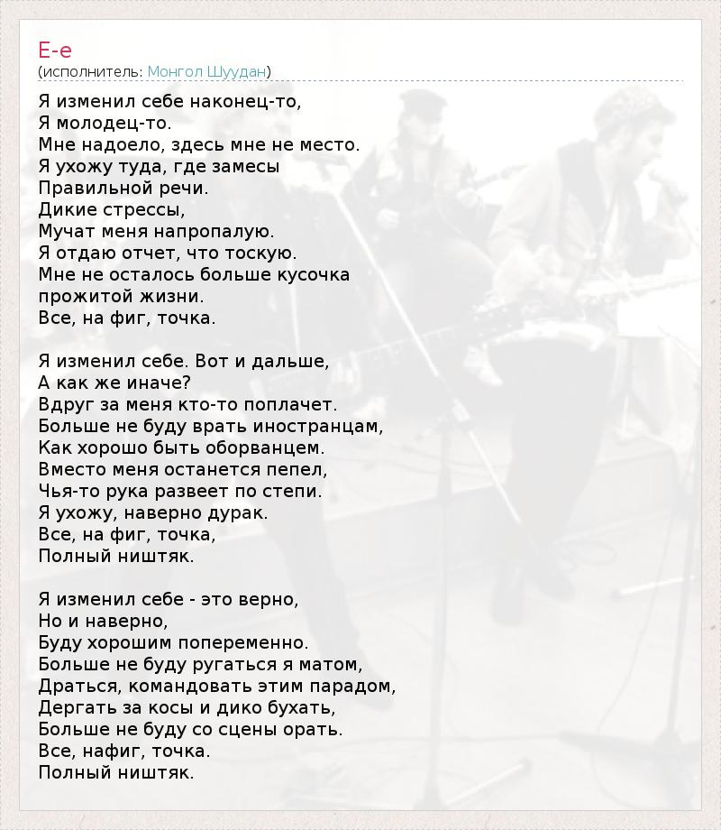 Это интересно:Немного о названии: «Всё было очень просто. Стояли на остановке, рядом — киоск „Союзпечать“, в нём марки, красивые такие, „Монгол Шуудан“, „Монгольская почта“ значит. Просто дело случая и никаких монгольских корней.» (Валерий Скородед)Образована в 1985 году в Москве. До 1988 года носила название «Половой Акт». Первый концерт состоялся 1 апреля 1989 года, который считается днём рождения... продолжение