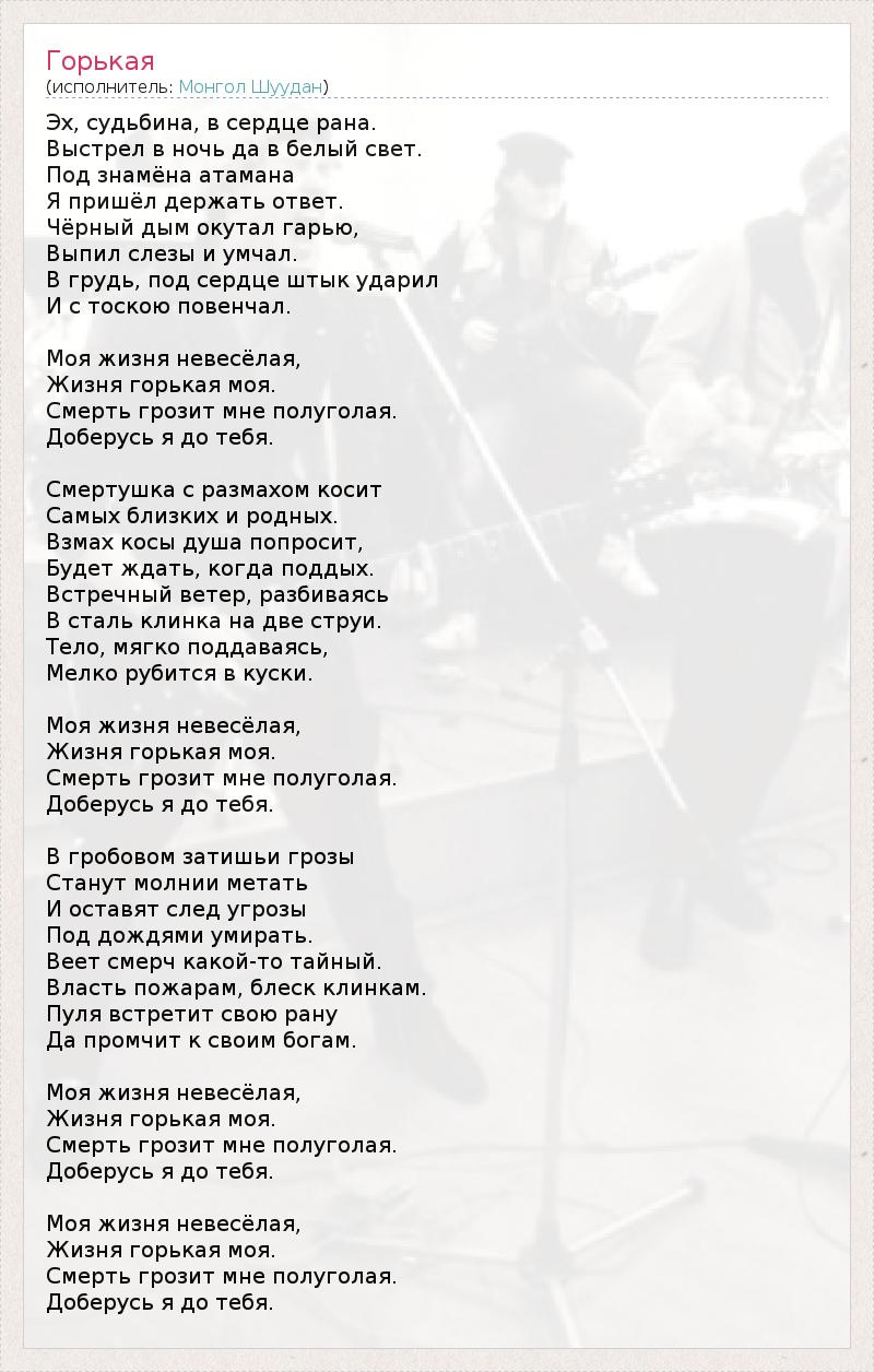 Это интересно:Немного о названии: «Всё было очень просто. Стояли на остановке, рядом — киоск „Союзпечать“, в нём марки, красивые такие, „Монгол Шуудан“, „Монгольская почта“ значит. Просто дело случая и никаких монгольских корней.» (Валерий Скородед)Образована в 1985 году в Москве. До 1988 года носила название «Половой Акт». Первый концерт состоялся 1 апреля 1989 года, который считается днём рождения... продолжение