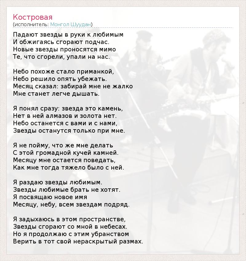 Это интересно:Немного о названии: «Всё было очень просто. Стояли на остановке, рядом — киоск „Союзпечать“, в нём марки, красивые такие, „Монгол Шуудан“, „Монгольская почта“ значит. Просто дело случая и никаких монгольских корней.» (Валерий Скородед)Образована в 1985 году в Москве. До 1988 года носила название «Половой Акт». Первый концерт состоялся 1 апреля 1989 года, который считается днём рождения... продолжение