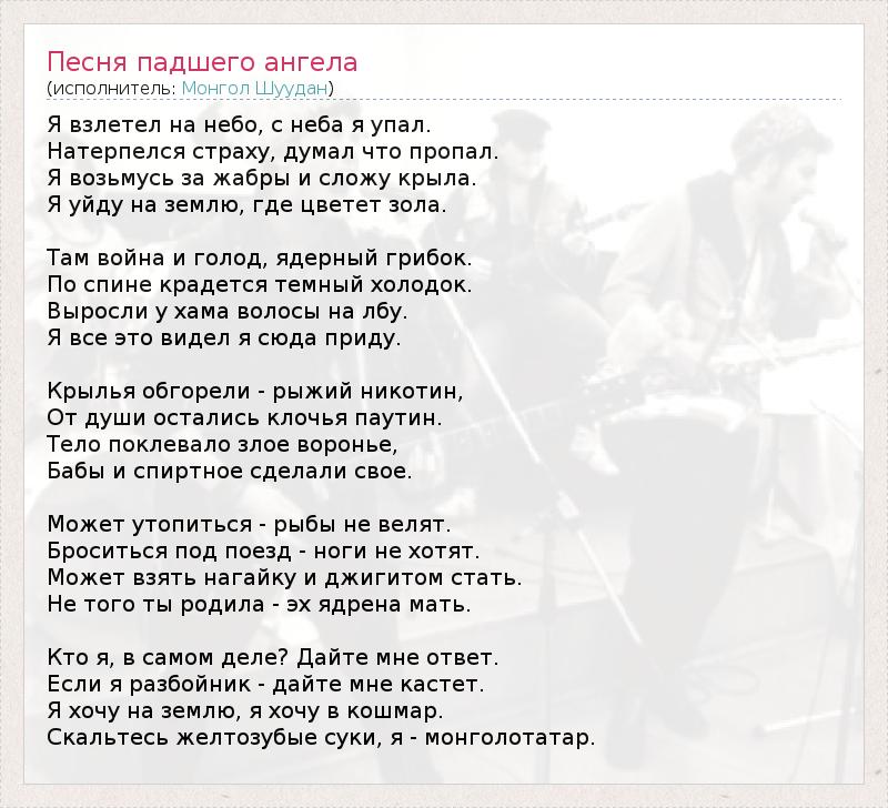 ГлавнаяИсполнителиМонгол ШууданПесня падшего ангела
