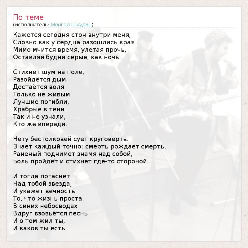 Это интересно:Немного о названии: «Всё было очень просто. Стояли на остановке, рядом — киоск „Союзпечать“, в нём марки, красивые такие, „Монгол Шуудан“, „Монгольская почта“ значит. Просто дело случая и никаких монгольских корней.» (Валерий Скородед)Образована в 1985 году в Москве. До 1988 года носила название «Половой Акт». Первый концерт состоялся 1 апреля 1989 года, который считается днём рождения... продолжение