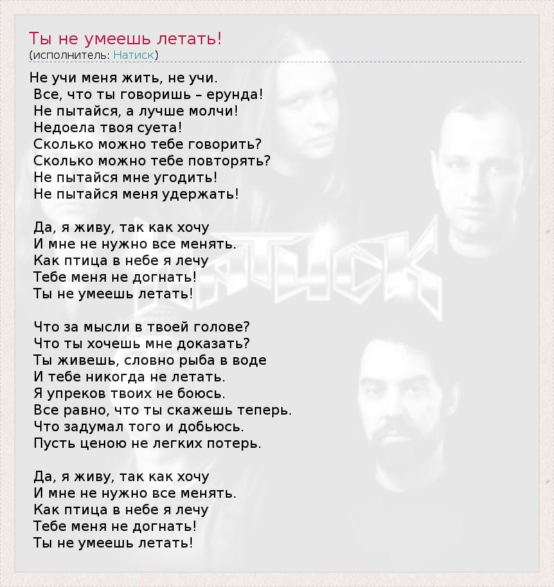 Не учи меня жить, не учи. Все, что ты говоришь – ерунда! Не пытайся, а лучше молчи! Недоела твоя суета! Сколько можно тебе говорить? Сколько можно тебе повторять? Не пытайся мне угодить! Не пытайся меня удержать! Да, я живу, так как хочу И мне не нужно все менять. Как птица в небе я лечу Тебе меня не догнать! Ты не умеешь летать! Что за мысли в твоей голове? Что ты хочешь мне доказать? Ты живешь, словно рыба в воде И тебе никогда не летать. Я упреков твоих не боюсь. Все равно, что ты скажешь теперь. Что задумал того и добьюсь. Пусть ценою не легких потерь. Да, я живу, так как хочу И мне не нужно все менять. Как птица в небе я лечу Тебе меня не догнать! Ты не умеешь летать! Натиск - Ты не умеешь летать http://megalyrics.ru/lyric/%D0%BD%D0%B0%D1%82%D0%B8%D1%81%D0%BA/%D1%82%D1%8B-%D0%BD%D0%B5-%D1%83%D0%BC%D0%B5%D0%B5%D1%88%D1%8C-%D0%BB%D0%B5%D1%82%D0%B0%D1%82%D1%8C.htm#ixzz23tjeeVeU