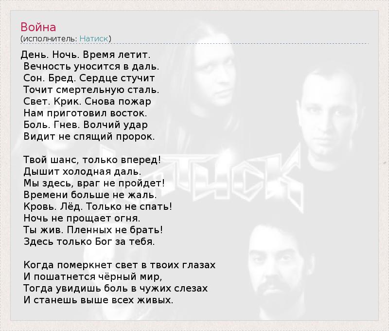 Натиск - Война http://megalyrics.ru/lyric/%D0%BD%D0%B0%D1%82%D0%B8%D1%81%D0%BA/%D0%B2%D0%BE%D0%B9%D0%BD%D0%B0.htm#ixzz23tjzaaaY
