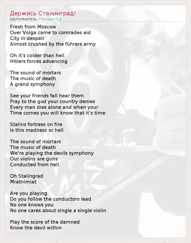 Fresh from Moscow Over Volga came to comrades aid City in despair Almost crushed by the führers army Oh it's colder than hell Hitlers forces advancing The sound of mortars The music of death A grand symphony See your friends fall hear them Pray to the god your country denies Every man dies alone and when your Time comes you will know that it's time Stalins fortress on fire Is this madness or hell The sound of mortars The music of death We're playing the devils symphony Our violins are guns Conducted from hell Oh Stalingrad Mratnimiat Are you playing Do you follow the conductors lead No one knows you No one cares about single a single violin Play the score of the damned Know the devil within