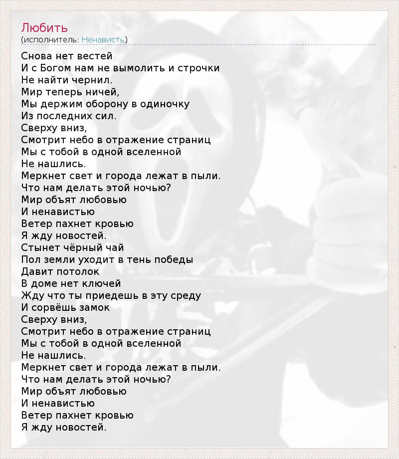 Снова нет вестей И с Богом нам не вымолить и строчки Не найти чернил. Мир теперь ничей, Мы держим оборону в одиночку Из последних сил. Сверху вниз, Смотрит небо в отражение страниц Мы с тобой в одной вселенной Не нашлись. Меркнет свет и города лежат в пыли. Что нам делать этой ночью? Мир объят любовью И ненавистью Ветер пахнет кровью Я жду новостей. Стынет чёрный чай Пол земли уходит в тень победы Давит потолок В доме нет ключей Жду что ты приедешь в эту среду И сорвёшь замок Сверху вниз, Смотрит небо в отражение страниц Мы с тобой в одной вселенной Не нашлись. Меркнет свет и города лежат в пыли. Что нам делать этой ночью? Мир объят любовью И ненавистью Ветер пахнет кровью Я жду новостей.