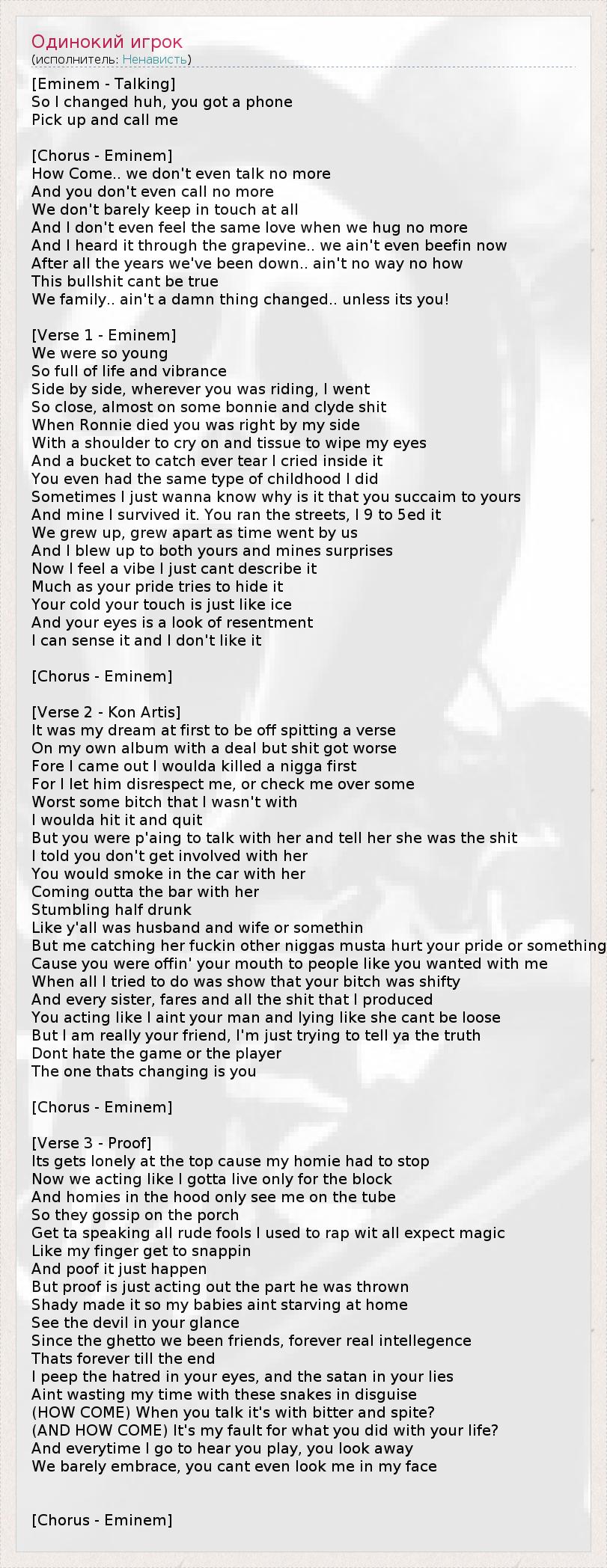 [Eminem говорит] Так я изменился... ну-ну... у тебя есть телефон, Возьми и позвони мне. [Припев: Eminem] Почему так получилось, что мы больше не разговариваем, И ты даже не звонишь. Мы вообще не поддерживаем связь. И я уже даже не чувствую ту теплоту, когда мы обнимаем друг друга. И до меня дошли слухи... Мы ведь даже не в ссоре сейчас... После всех тех лет, что были вместе... Нет уж, эта чушь не может быть правдой. Мы семья и ни черта не изменилось... разве только ты! [1-ый куплет: Eminem] Мы были так молоды, Волны жизни и желаний. Бок о бок, где был ты, там был и я. Настолько близкие, почти как Бонни и Клайд. Когда Ронни умер, ты был рядом со мной, Я плакал на твоем плече, а ты заботливо вытирал мне слезы И ловил каждую упавшую слезинку. У тебя даже было такое же детство, как и у меня. Иногда я хочу знать, почему ты так сделал. Я пережил это. Ты шатался по улицам. Я работал с 9 до 5. Мы взрослели, отдалялись друг от друга, время бежало. И я добился успеха на удивление нам обоим. Теперь я чувствую то, что не могу описать. Почти как твоя гордость, которую ты скрываешь. Ты холоден, твои рукопожатия как лед. И в твоих глазах видна обида. Я чувствую это, и мне это не нравится. [Припев:] [2-ой куплет: Kon Artis] Моей голубой мечтой всегда было читать рэп И выпустить свой собственный альбом, заключить контракт, но все оказалось хуже. Я, наверное, завалю кого-то, Но не позволю ему не уважать меня, или упрекать меня За ту суку, с которой я не был. Я бы тра*нул ее и ушел, Но ты хотел поговорить с ней и сказать, что она была клевой. Я говорил тебе - не увлекайся ей. Ты курил вместе с ней, Выходил из бара вместе с ней, И вы спотыкались, как подвыпившие, Типа вы были мужем и женой или что-то типа этого. Но я засек, что она тра*ается с другими ниггерами, должно быть это задело Твою гордость, ты трепался так, будто тебе было что-то надо от меня. Все, что я хотел сделать, это доказать, что твоя девка обманывает тебя. Девок и жратву - все доставал я. Ты ведешь себя так, как будто я не твой друг, и как будто я вру, что она изменяет тебе. Но я действительно твой друг, я просто пытаюсь сказать тебе правду. Не надо ненавидеть игру или игрока. Единственное, что изменилось, это ты. [Припев: Eminem] [3-ий куплет: Proof] Становится одиноко, моему корешу пришлось остановиться. Мы ведем себя так, будто живем только ради квартала. И братаны в районе видят меня только по телеку. Так что теперь они сплетничают на крыльце. Говорите, что хотите, все, с кем я обычно рэпповал. Ждите чуда После щелчка моих пальцев. Уф, это только что случилось. Но Proof просто играет свою роль, которую ему дали. Shady помог, так что мои крошки не голодают теперь дома. Вижу дьявола в твоем взгляде. Со времён гетто мы были друзьями, всегда были сообразительными. Так должно быть вечно, до самого конца. Я замечаю ненависть в твоих глазах, и сатану в твоей лжи. Не трачу свое время с этими змеями под масками. (ПОЧЕМУ) Ты говоришь с горечью и злостью? (И ПОЧЕМУ) Ты считаешь, что я виноват в том, во что ты превратил свою жизнь? И каждый раз, когда я иду послушать, как ты играешь, ты отводишь взгляд. Мы едва обнимаемся, и ты даже не можешь взглянуть мне в лицо. [Припев: Eminem]