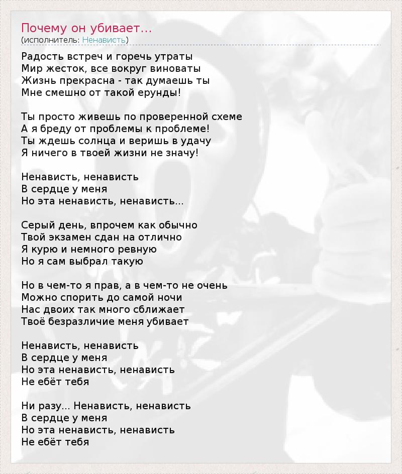 Радость встреч и горечь утраты Мир жесток, все вокруг виноваты Жизнь прекрасна - так думаешь ты Мне смешно от такой ерунды! Ты просто живешь по проверенной схеме А я бреду от проблемы к проблеме! Ты ждешь солнца и веришь в удачу Я ничего в твоей жизни не значу! Ненависть, ненависть В сердце у меня Но эта ненависть, ненависть... Серый день, впрочем как обычно Твой экзамен сдан на отлично Я курю и немного ревную Но я сам выбрал такую Но в чем-то я прав, а в чем-то не очень Можно спорить до самой ночи Нас двоих так много сближает Твоё безразличие меня убивает Ненависть, ненависть В сердце у меня Но эта ненависть, ненависть Не ебёт тебя Ни разу... Ненависть, ненависть В сердце у меня Но эта ненависть, ненависть Не ебёт тебя