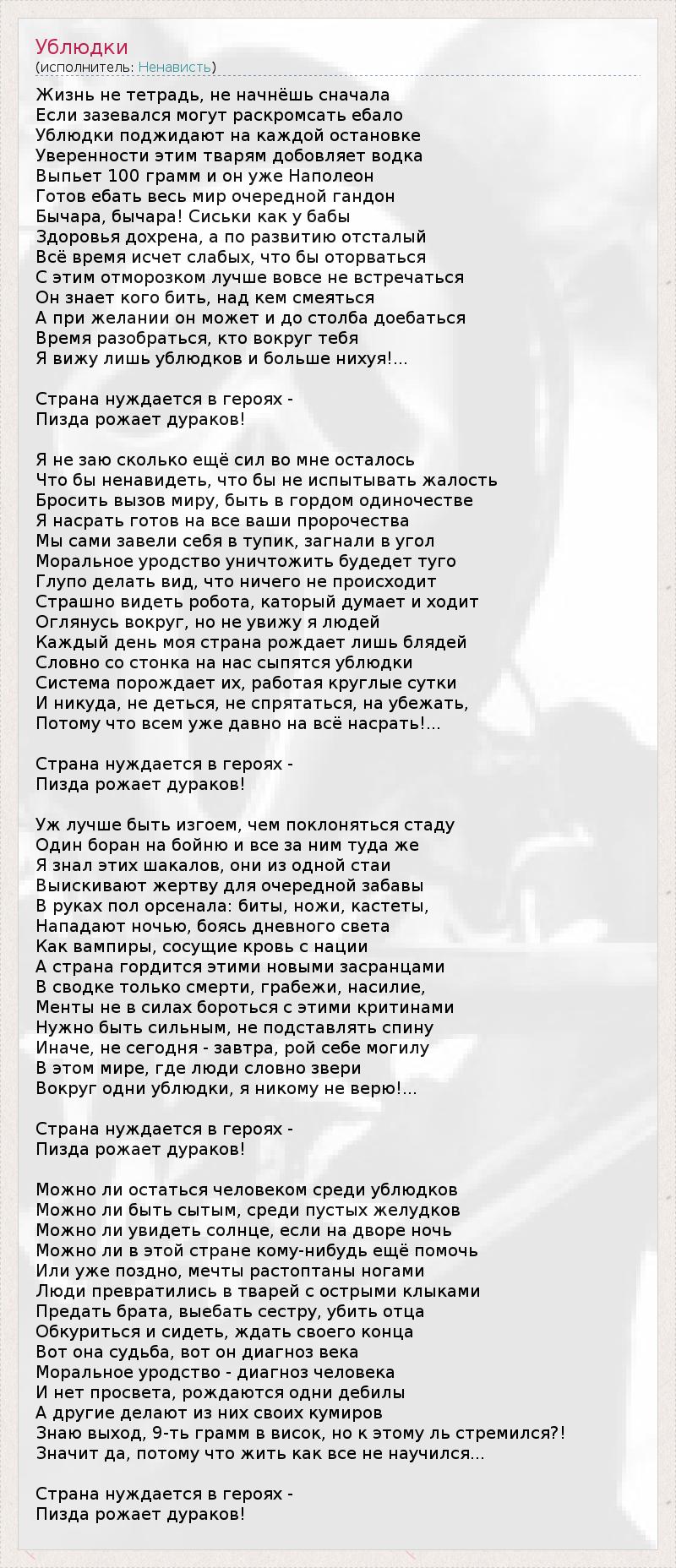 Жизнь не тетрадь, не начнёшь сначала Если зазевался могут раскромсать ебало Ублюдки поджидают на каждой остановке Уверенности этим тварям добовляет водка Выпьет 100 грамм и он уже Наполеон Готов ебать весь мир очередной гандон Бычара, бычара! Сиськи как у бабы Здоровья дохрена, а по развитию отсталый Всё время исчет слабых, что бы оторваться С этим отморозком лучше вовсе не встречаться Он знает кого бить, над кем смеяться А при желании он может и до столба доебаться Время разобраться, кто вокруг тебя Я вижу лишь ублюдков и больше нихуя!... Страна нуждается в героях - Пизда рожает дураков! Я не заю сколько ещё сил во мне осталось Что бы ненавидеть, что бы не испытывать жалость Бросить вызов миру, быть в гордом одиночестве Я насрать готов на все ваши пророчества Мы сами завели себя в тупик, загнали в угол Моральное уродство уничтожить будедет туго Глупо делать вид, что ничего не происходит Страшно видеть робота, каторый думает и ходит Оглянусь вокруг, но не увижу я людей Каждый день моя страна рождает лишь блядей Словно со стонка на нас сыпятся ублюдки Система порождает их, работая круглые сутки И никуда, не деться, не спрятаться, на убежать, Потому что всем уже давно на всё насрать!... Страна нуждается в героях - Пизда рожает дураков! Уж лучше быть изгоем, чем поклоняться стаду Один боран на бойню и все за ним туда же Я знал этих шакалов, они из одной стаи Выискивают жертву для очередной забавы В руках пол орсенала: биты, ножи, кастеты, Нападают ночью, боясь дневного света Как вампиры, сосущие кровь с нации А страна гордится этими новыми засранцами В сводке только смерти, грабежи, насилие, Менты не в силах бороться с этими критинами Нужно быть сильным, не подставлять спину Иначе, не сегодня - завтра, рой себе могилу В этом мире, где люди словно звери Вокруг одни ублюдки, я никому не верю!... Страна нуждается в героях - Пизда рожает дураков! Можно ли остаться человеком среди ублюдков Можно ли быть сытым, среди пустых желудков Можно ли увидеть солнце, если на дворе ночь Можно ли в этой стране кому-нибудь ещё помочь Или уже поздно, мечты растоптаны ногами Люди превратились в тварей с острыми клыками Предать брата, выебать сестру, убить отца Обкуриться и сидеть, ждать своего конца Вот она судьба, вот он диагноз века Моральное уродство - диагноз человека И нет просвета, рождаются одни дебилы А другие делают из них своих кумиров Знаю выход, 9-ть грамм в висок, но к этому ль стремился?! Значит да, потому что жить как все не научился... Страна нуждается в героях - Пизда рожает дураков!