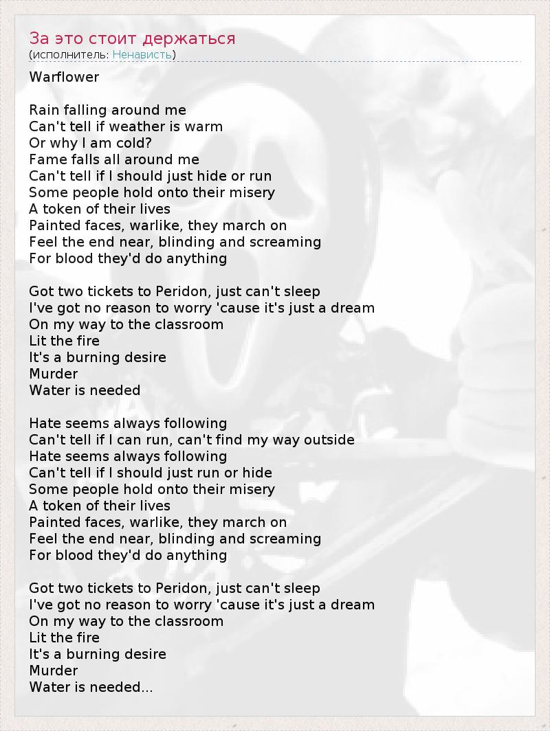 Дождь вокруг меня Не могу сказать, если стоит теплая погода Или почему мне холодно? Слава падает все вокруг меня Не могу сказать, если я просто скрыться или бежать Некоторые люди будут держаться за свои страдания Знак своей жизни Окрашенные лица, воинственные, они похода на Почувствуйте конец близок, ослепляя и кричать В крови они ничего Есть два билета на Peridon, просто не могу спать У меня нет причин для беспокойства, потому что это просто мечта По дороге в класс Горит огонь Это жгучее желание Убийство Вода необходима Ненависть, кажется, всегда следующие Не могу сказать, если я могу работать, не может найти свой путь за пределами Ненависть, кажется, всегда следующие Не могу сказать, если я должен просто запустить или скрыть Некоторые люди будут держаться за свои страдания Знак своей жизни Окрашенные лица, воинственные, они похода на Почувствуйте конец близок, ослепляя и кричать В крови они ничего Есть два билета на Peridon, просто не могу спать У меня нет причин для беспокойства, потому что это просто мечта По дороге в класс Горит огонь Это жгучее желание Убийство Вода необходима ...