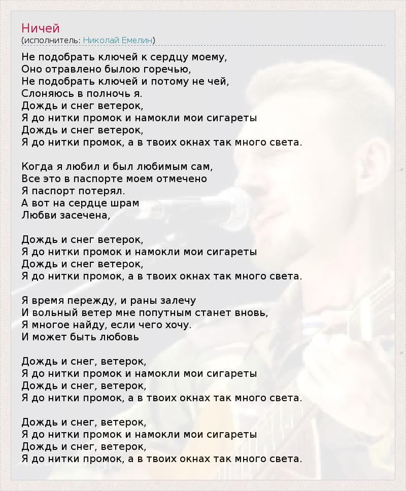 Это интересно:ЕМЕЛИН Николай Николаевич. Родился 25 июля 1965 г.Родина - Западная Сибирь, казачья станица Каряковка (теперь это север Казахстана).Начало творческого пути - 1980 год. 1983-1985 гг. - служба Отечеству.В период с 1986 по 1988 гг. - победитель многих Всесоюзных фестивалей, конкурсов авторской песни среди авторов и исполнителей. На профессиональной сцене с 1988 года.Первый виниловый... продолжение