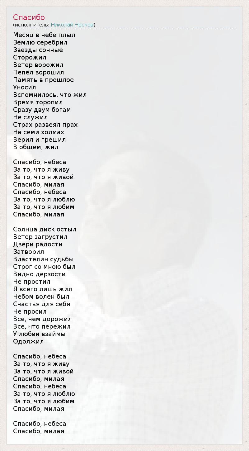 Месяц в небе плыл Землю серебрил Звезды сонные Сторожил Ветер ворожил Пепел ворошил Память в прошлое Уносил Вспомнилось, что жил Время торопил Сразу двум богам Не служил Страх развеял прах На семи холмах Верил и грешил В общем, жил Спасибо, небеса За то, что я живу За то, что я живой Спасибо, милая Спасибо, небеса За то, что я люблю За то, что я любим Спасибо, милая Солнца диск остыл Ветер загрустил Двери радости Затворил Властелин судьбы Строг со мною был Видно дерзости Не простил Я всего лишь жил Небом волен был Счастья для себя Не просил Все, чем дорожил Все, что пережил У любви взаймы Одолжил Спасибо, небеса За то, что я живу За то, что я живой Спасибо, милая Спасибо, небеса За то, что я люблю За то, что я любим Спасибо, милая Спасибо, небеса Спасибо, милая