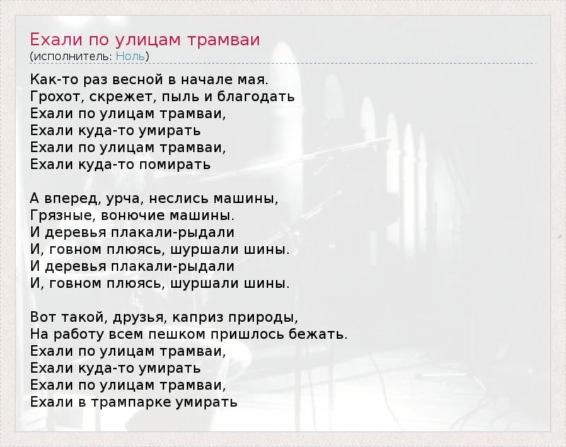 Как-то раз весной в начале мая. Грохот, скрежет, пыль и благодать Ехали по улицам трамваи, Ехали куда-то умирать Ехали по улицам трамваи, Ехали куда-то помирать А вперед, урча, неслись машины, Грязные, вонючие машины. И деревья плакали-рыдали И, говном плюясь, шуршали шины. И деревья плакали-рыдали И, говном плюясь, шуршали шины. Вот такой, друзья, каприз природы, На работу всем пешком пришлось бежать. Ехали по улицам трамваи, Ехали куда-то умирать Ехали по улицам трамваи, Ехали в трампарке умирать
