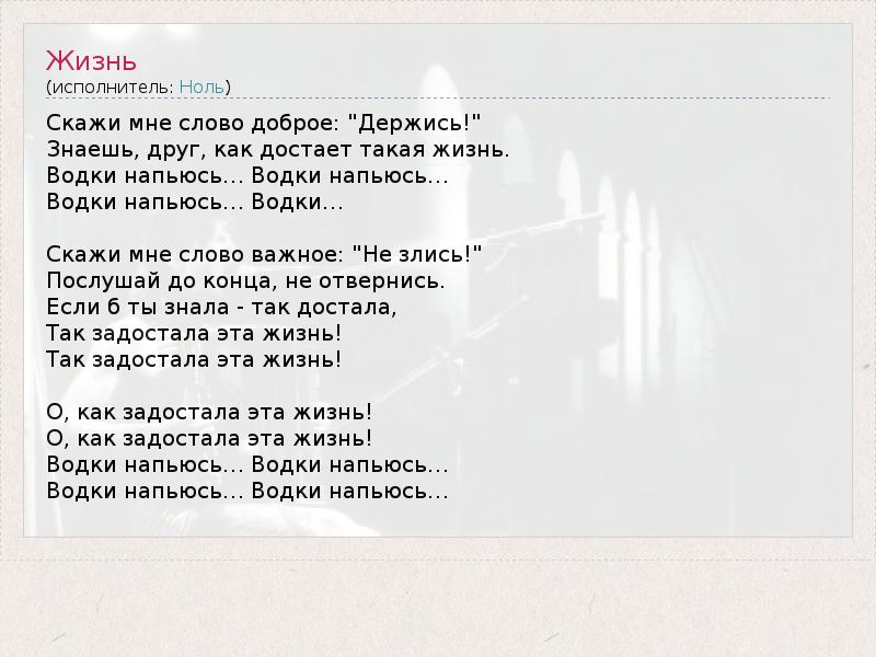 Скажи мне слово доброе: "Держись!" Знаешь, друг, как достает такая жизнь. Водки напьюсь… Водки напьюсь… Водки напьюсь… Водки… Скажи мне слово важное: "Не злись!" Послушай до конца, не отвернись. Если б ты знала - так достала, Так задостала эта жизнь! Так задостала эта жизнь! О, как задостала эта жизнь! О, как задостала эта жизнь! Водки напьюсь… Водки напьюсь… Водки напьюсь… Водки напьюсь…