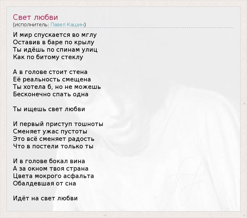 Это интересно:Певец Павел Кашин — особое явление в русской музыке. Начиная с первых песен, которые около десяти лет назад принесли ему славу («Безумно дивный чудный город», «Гномики») и вплоть до последнего альбома «Ассоль немного подождёт», вышедшего недавно, он остаётся проблемой для музыкальных критиков. Как его оценивать? Грустные, меланхоличные песни, исполняемые детским голосом Кашина, — не... продолжение