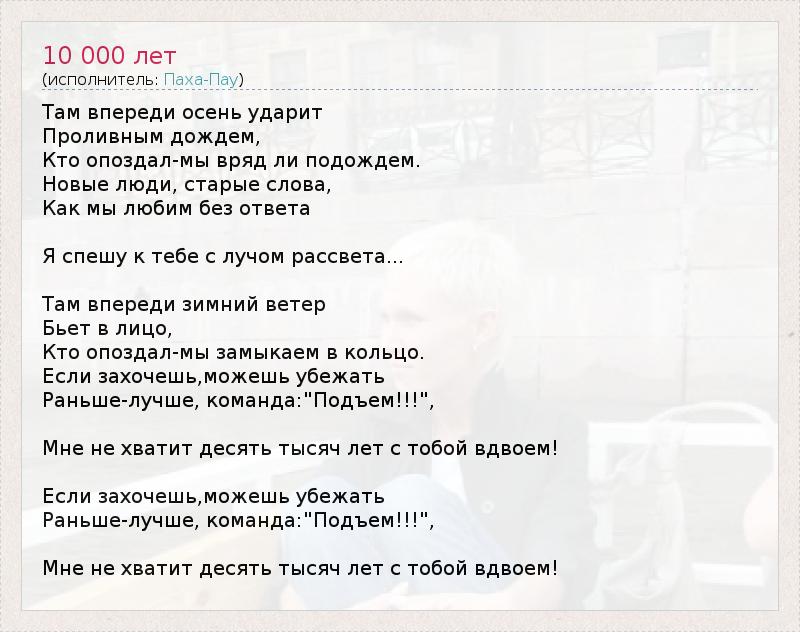 Там впереди осень ударит Проливным дождем, Кто опоздал-мы вряд ли подождем. Новые люди, старые слова, Как мы любим без ответа Я спешу к тебе с лучом рассвета... Там впереди зимний ветер Бьет в лицо, Кто опоздал-мы замыкаем в кольцо. Если захочешь,можешь убежать Раньше-лучше, команда:"Подъем!!!", Мне не хватит десять тысяч лет с тобой вдвоем! Если захочешь,можешь убежать Раньше-лучше, команда:"Подъем!!!", Мне не хватит десять тысяч лет с тобой вдвоем!